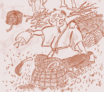 さあたいへん。おじじは、まっかになって、怒った(おこった)んやと。ほして何もかも、ほっぽり出いた(ほっぽりだいた)まま、一目散(いちもくさん)に山を下りていったんやと。 走って走って、ハァハァ言いながら、家の中へとび込み(とびこみ)、いきなり、おばばを、ポカポカとなぐりつけたんやとの。 「わりゃ、なんのつもりで弁当に枕なんか入れといたんや。だらけ!」 と、どなったら、 |